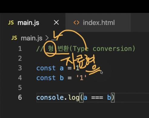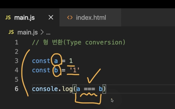 그런데 많은 프로그래밍 언어들이 이렇게 앞뒤에 있는 특정한 데이터를 비교할 때 이렇게 이퀄 기호 2개를 사용한다. 이 값과 이 값에 어떤 타입 변화가 일어나게 되고, 그것을 비교하게 되기 때문에 일치 연산자를 활용하는 것을 더 권장한다.