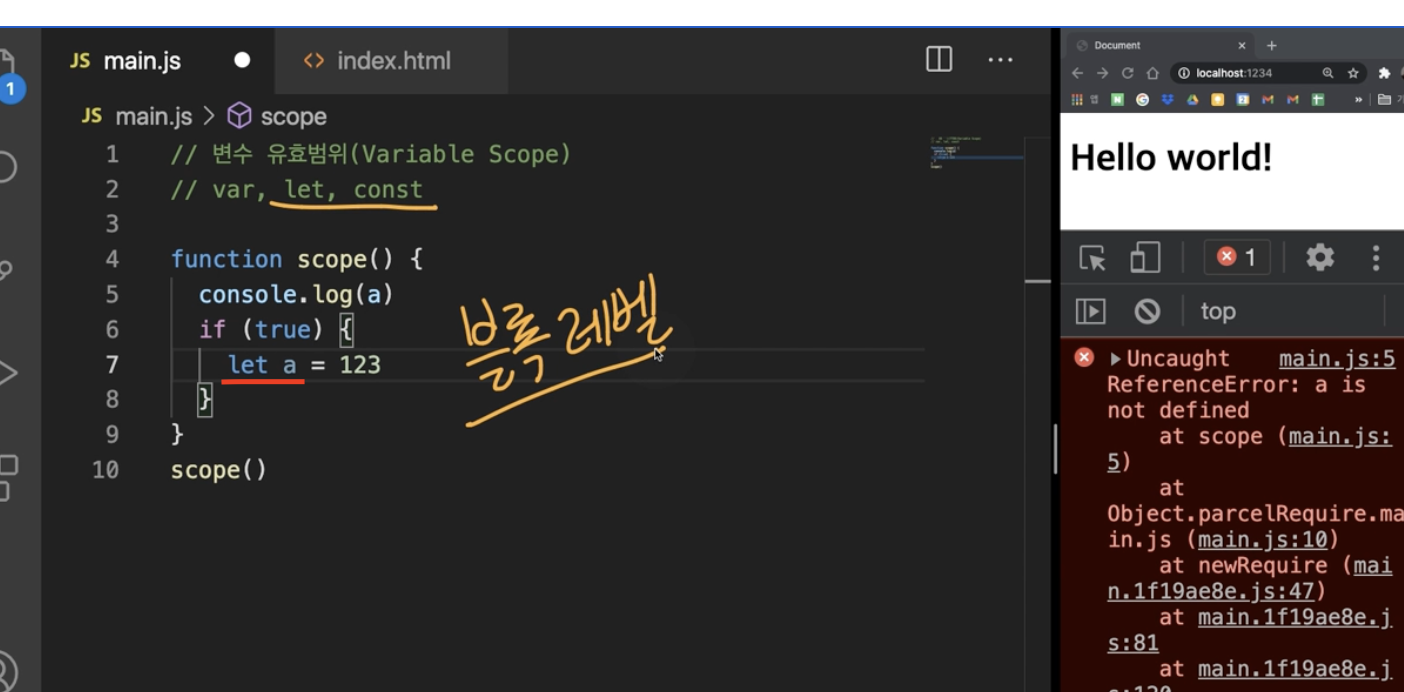 그래서 이 console.log a 부분을 다시 잘라서 변수가 선언되어져 있는 밑에 붙이면 유효한 범위 안에서 동작하는 것이기 때문에 a라는 변수가 콘솔에 잘 출력이 되는 거다.