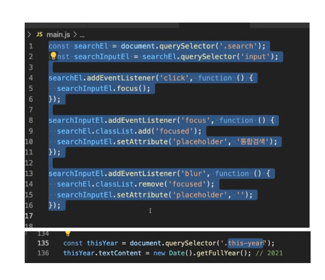 main.js에 있는 공통되는 부분(맨위 검색부분을 찾는 거부터 focus, blur 까지), (아래쪽 this year 부분만)을 common.js 에 잘라내서 붙여두고(복사붙여넣기 아님)