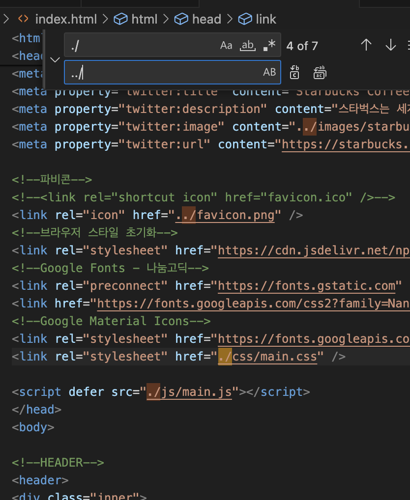 바꾼 이유는 signin 이라는 파일 안에 있는 index.html 이 되었기 때문에 한 번 더 밖으로 나가야 해서../ 라고 해야한다. 근데 파일 밖으로 나가야하는 것들이 하나만 있는 것도 아니고 내가 미처 못바꾼 부분도 발생할 수 있으니 컴퓨터를 믿고 파일을 찾아 검색하는 거다.