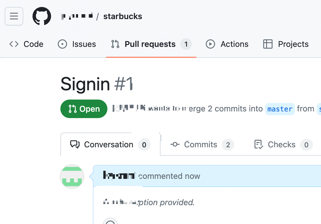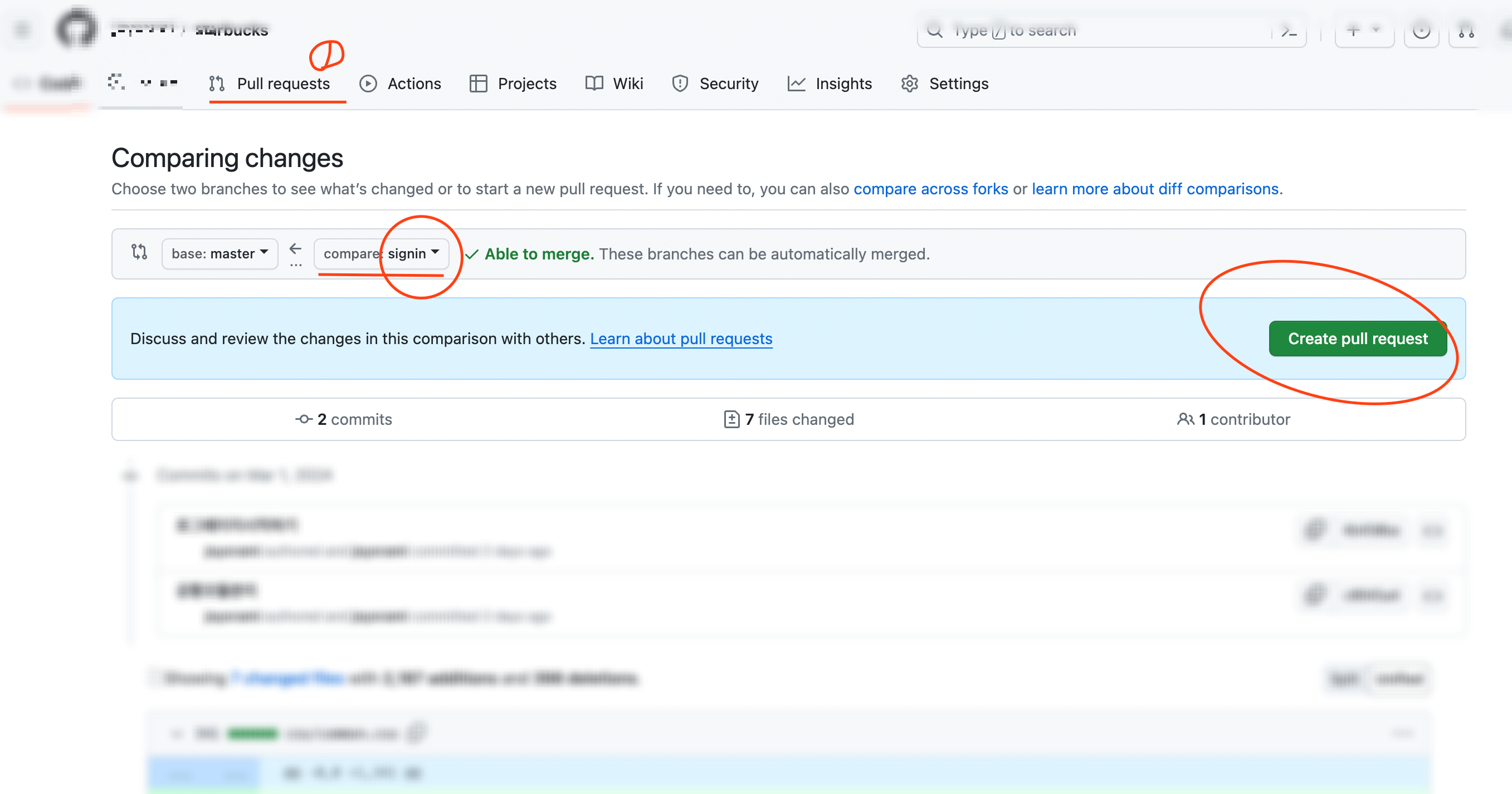 그러면 pullrequests를 누르고 compare 에 있는 걸 master에서 sign in으로 바꾸고, 바뀐 내용의 코드를 확인 한 후에 create pull request 를 누른다.