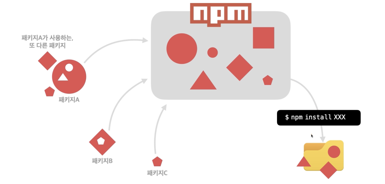node.js 라는 환경에서 npm이라는 개념으로 각각의 패키지를 직접적으로 설치하고 관리하고 하는 동작을 시켜줘야 한다.